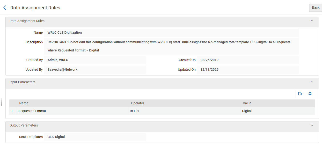 - WRLC CLS Digitization * (please note that, although this Rota Assignment Rule is active, the NZ Rota Template it uses is currently inactive)