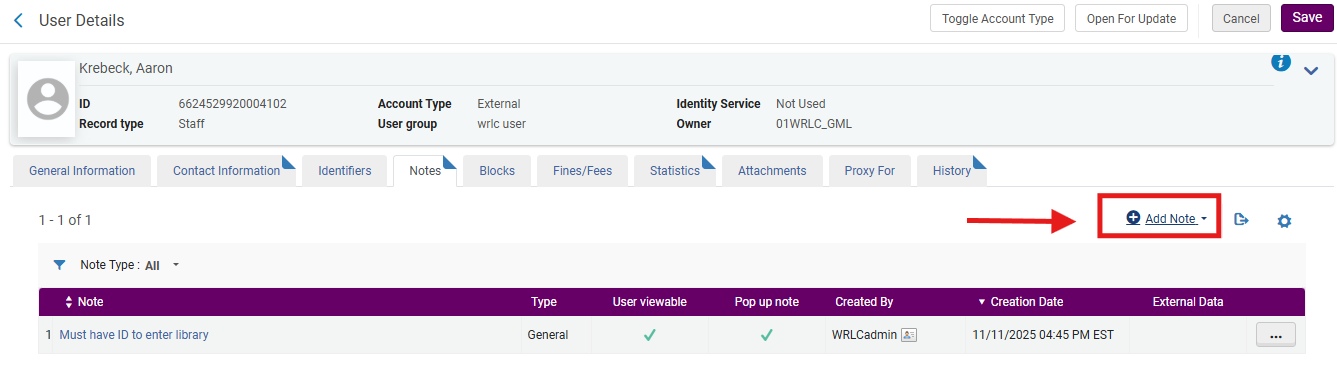 - When the patron’s record is accessed in Alma, the pop-up note appears automatically