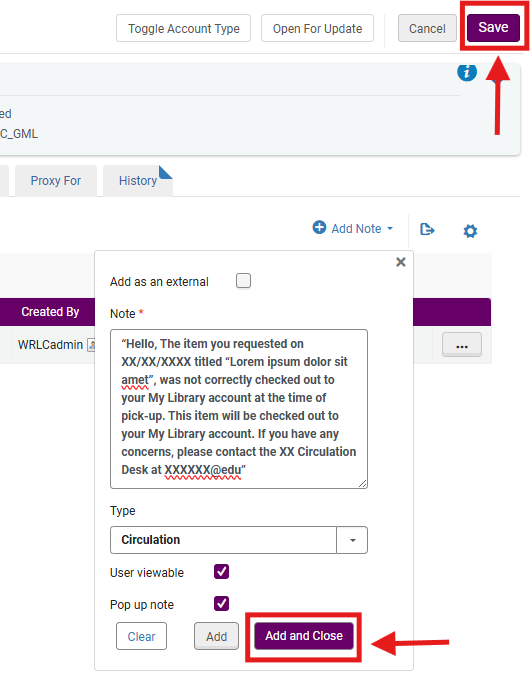 How to Add a Pop Up Note to a Patron's Account