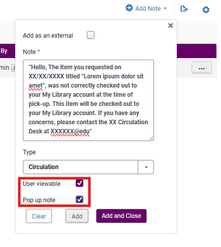 Use a pop-up note when staff need to see time-sensitive or high-importance information before completing circulation actions such as checkout, renewal, or fines processing.