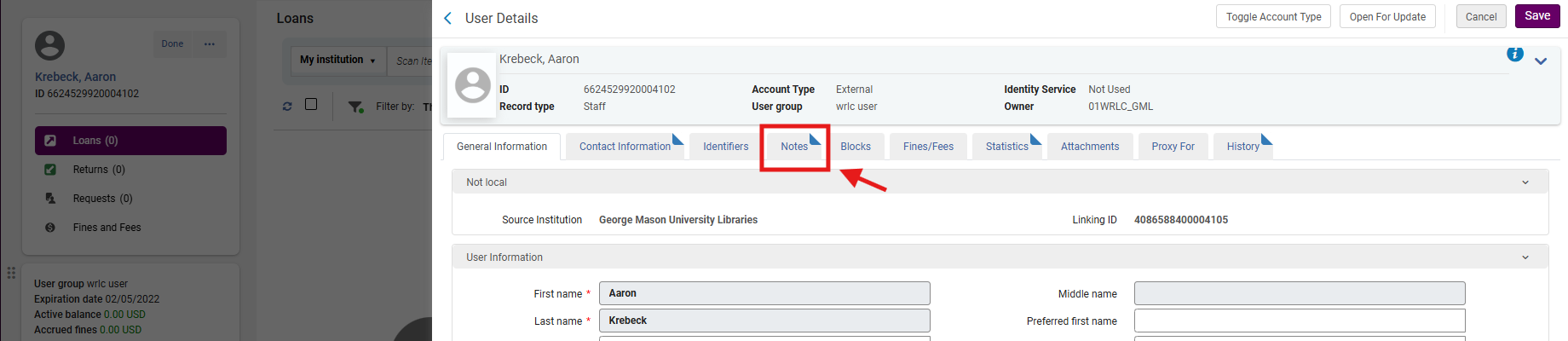 Note: The dog ear on the User Details tab indicates pre-existing information. In this example, the patron already has at least one Note attached to their account. A patron account can include several Notes.