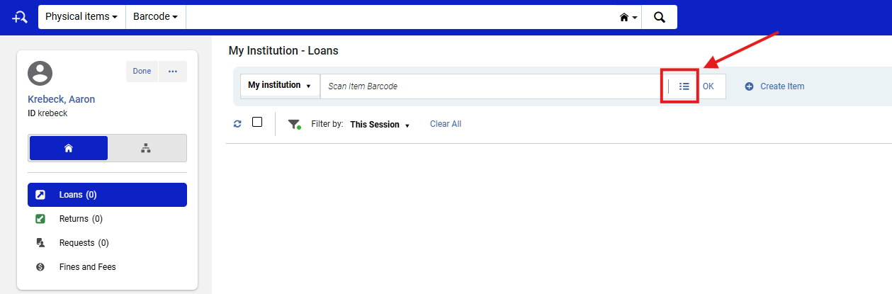 3: Use the <Select from a List> Option Click the <Select from a list> button next to the <Scan item barcode> field. This will allow you to to select from the Choose search index drop-down menu (ex. Keywords) and Choose search scope (ex. institution Zone -- house symbol)