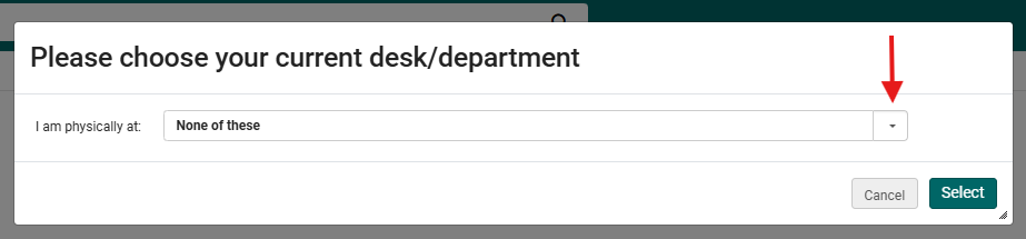 3: Select Your Desk/Department Click the dropdown arrow and select your correct desk/department. Click Select to confirm. Please note that images are for training purposes only. Your institution's selections will be different.