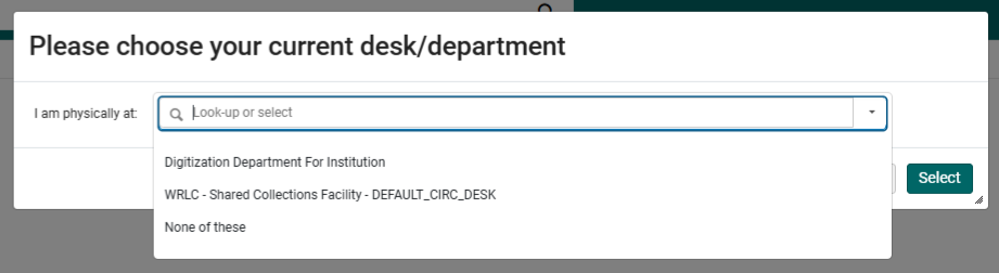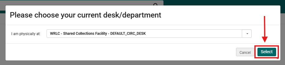 - Selecting the correct desk ensures all circulation and request transactions are recorded under the proper service point.