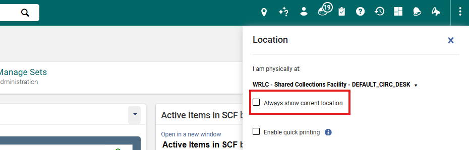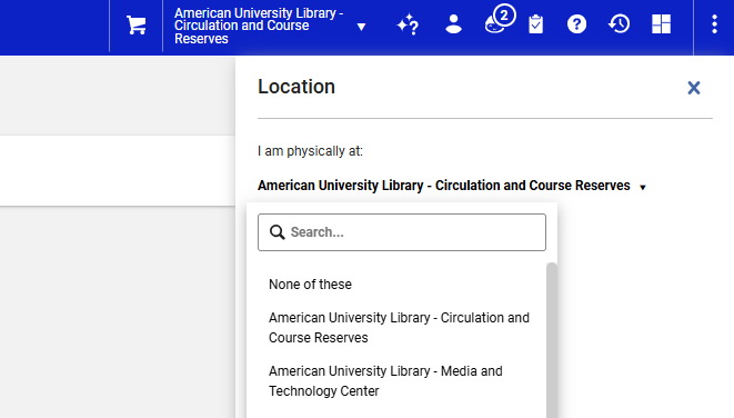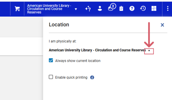 10. Change Locations To change your active location, click the location icon or text and open the dropdown menu. Then to display the available location options, click on the drop-down arrow. After selecting the correct desk or department, confirm your choice and proceed with circulation or fulfillment tasks.