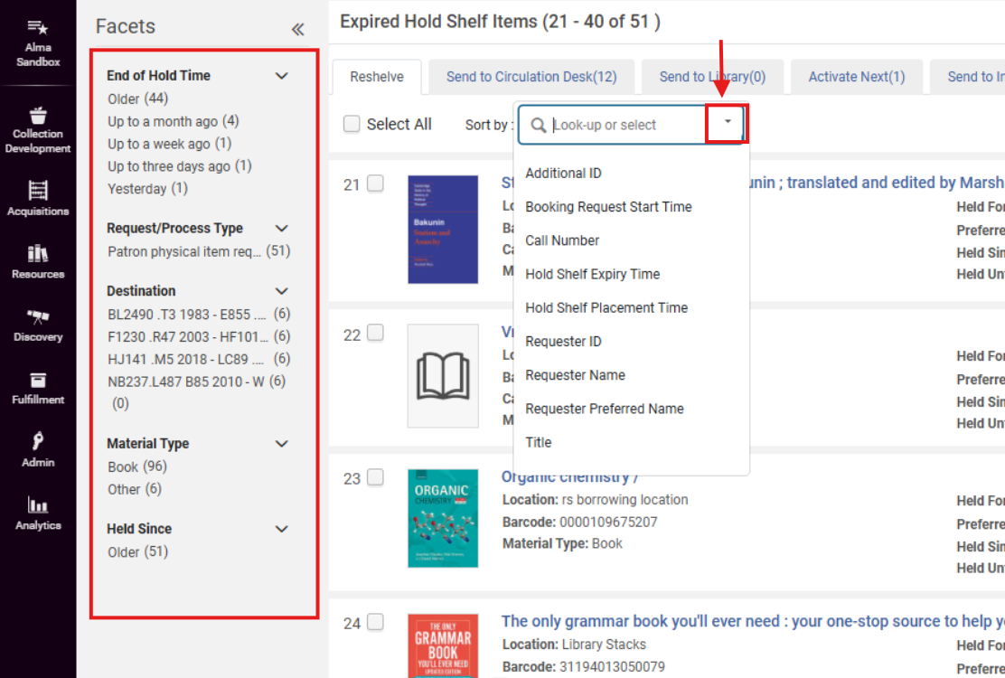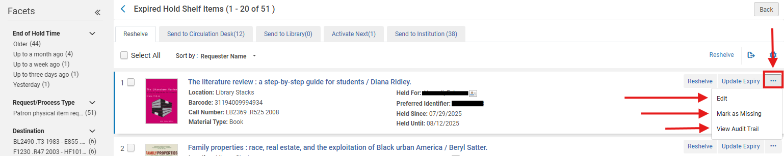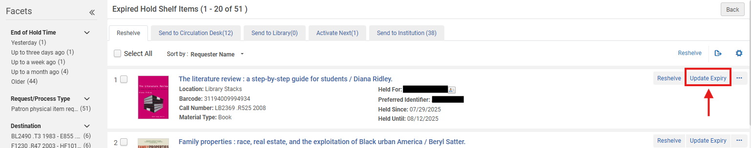 5: Manage Expired Holds Navigate to Fulfillment > Resource Requests> Expired Hold Shelf