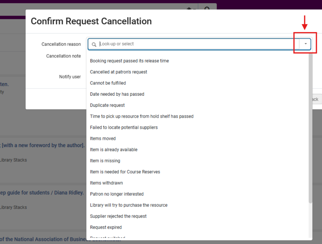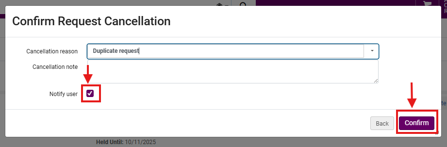 - In the confirmation pop-up, choose a cancellation reason, optionally add a note, uncheck Notify user if appropriate, then click <Confirm>