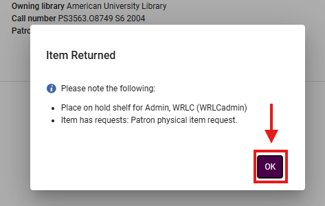 Why This Matters: This pop-up is Alma’s prompt that a pending request exists. Routing it correctly ensures the request is fulfilled and the item doesn’t re-enter general circulation.