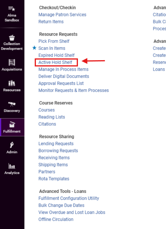 4: Manage Active Holds To view and manage all current holds, navigate to Fulfillment > Resource Requests> Active Hold Shelf> the Active Hold Shelf Items screen opens.