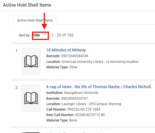 - Sort items: Use the <Sort by> drop-down to reorder the list by call number, date received, or patron