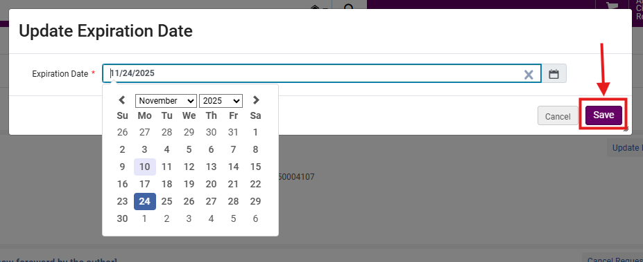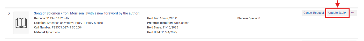 - Update expiration date: Click <Update Expiry>, choose a future date, and click <Save> to extend the hold.