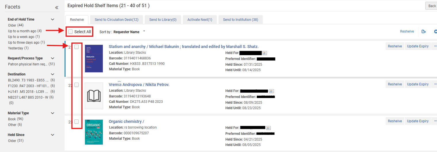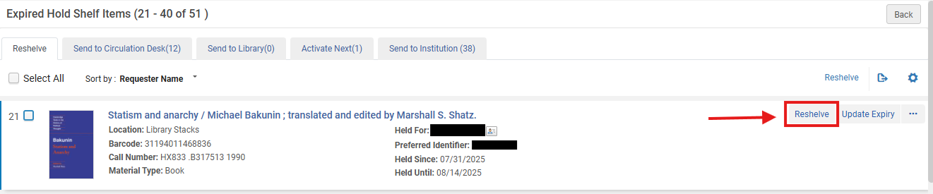 - The Expired Hold Shelf Items screen opens, showing items whose hold period has lapsed.