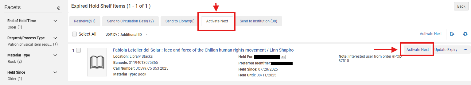 - Activate the next hold: Items with queued requests appear under the <Activate Next> tab.