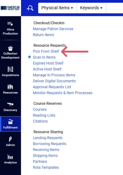 This workflow explains how to access and manage the Pick from Shelf list (also known as the Pick List) in Ex Libris Alma.