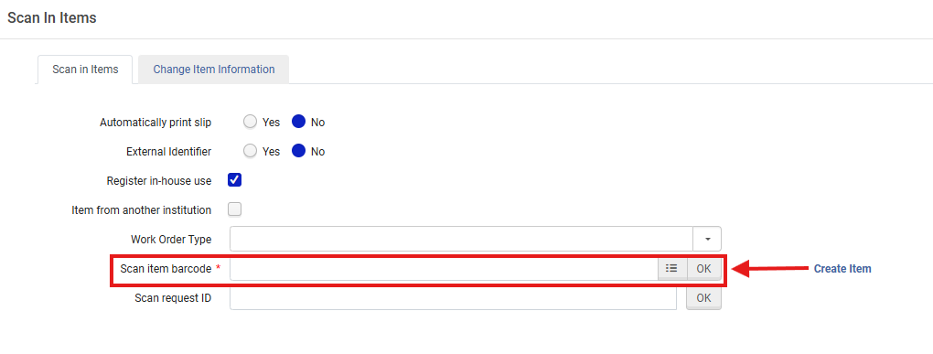 Note: Scan In Items processing updates the item’s workflow status automatically. For example, from Item in Place to Item in Transit or On Hold Shelf depending on request type and location.