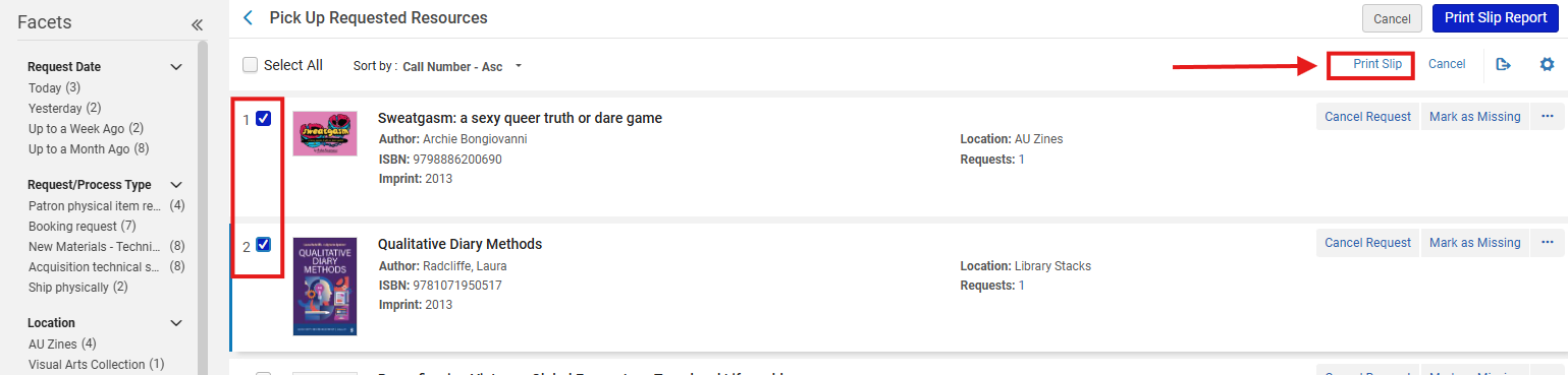 3: Print the Pick List or Individual Slips Printed slips contain location details, item barcodes, and destination information needed to retrieve materials accurately and efficiently. There are three ways to print or download the list for retrieval: