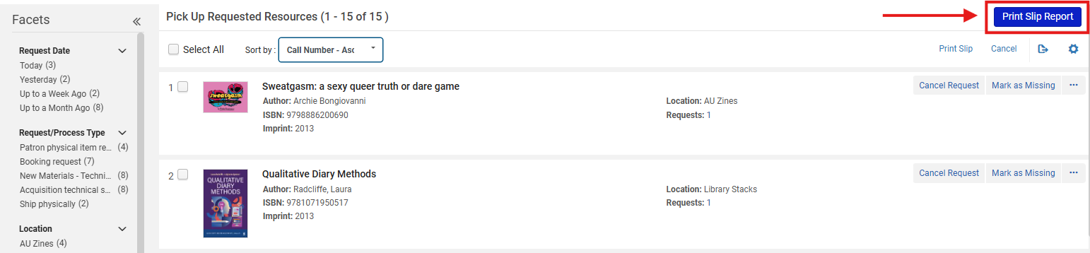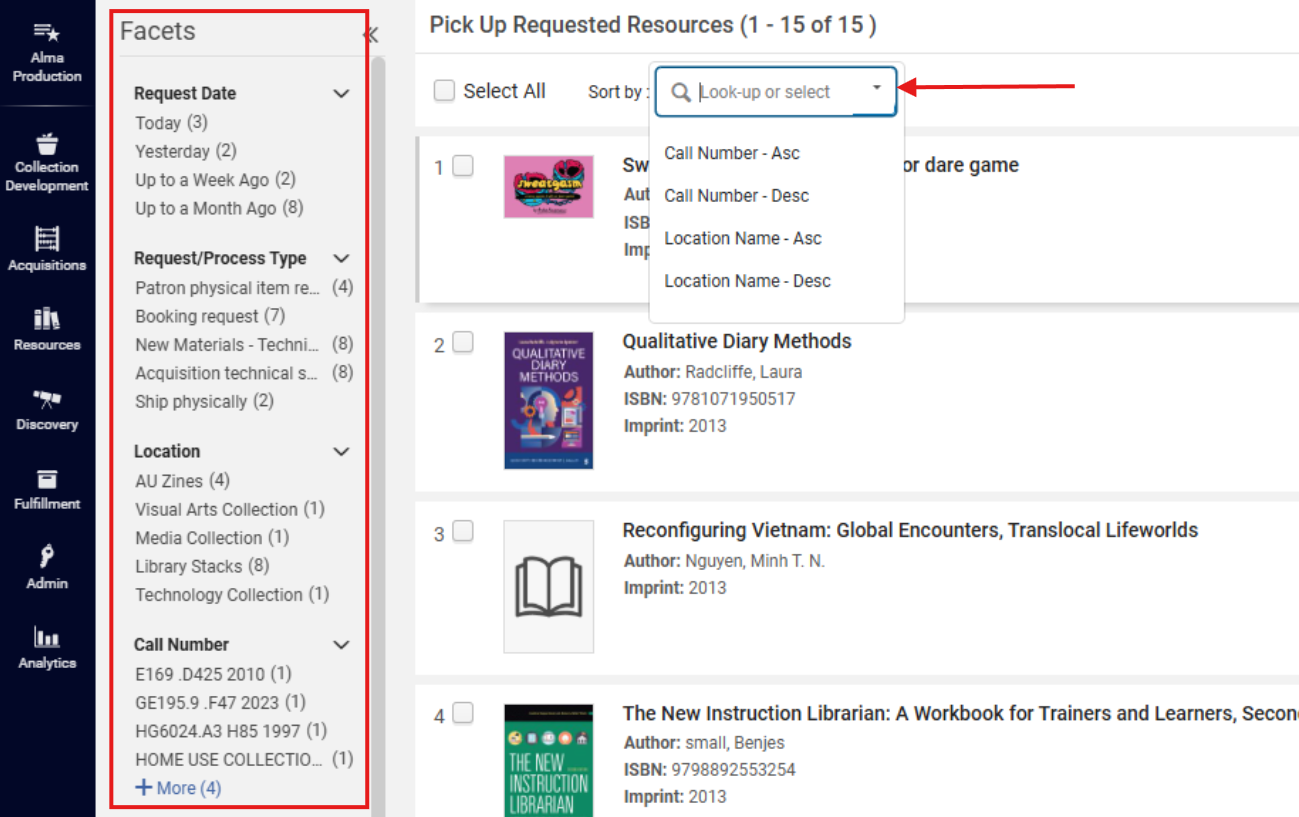 2: Review and Organize the List Use facets on the left-hand side or the <Sort by> menu to filter and organize results (e.g., by location, request type, or call number). Efficient sorting reduces retrieval time, especially in multi-location libraries.