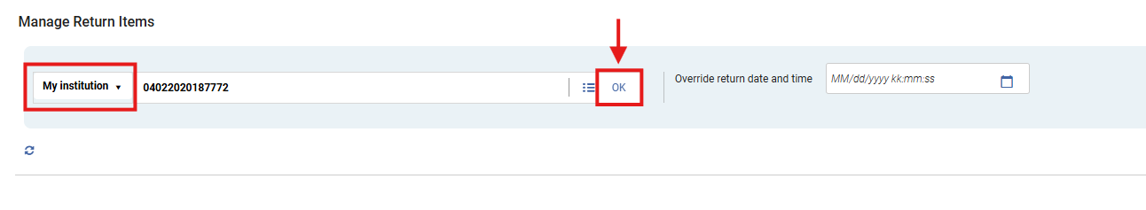 2: Scan the Item Barcode Ensure My Institution is selected and Scan the item barcode