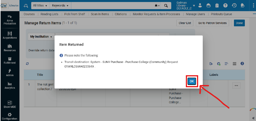 3: Confirm Transit Destination Alma displays a pop-up indicating Transit Destination to the lending partner; Click <OK>