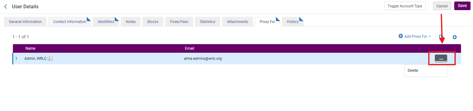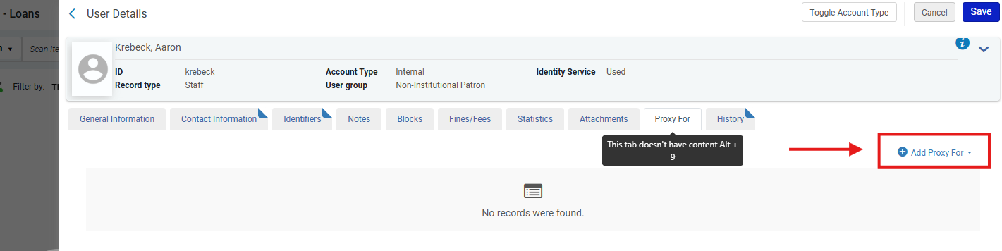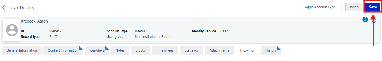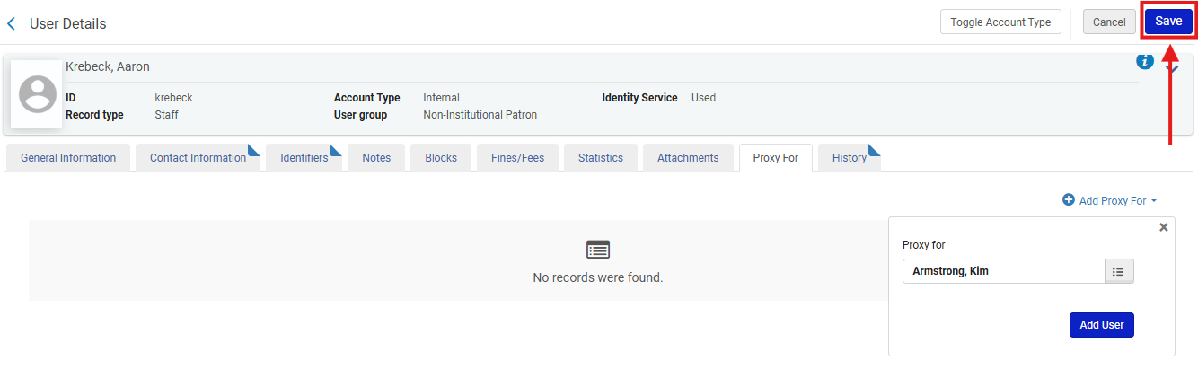 Note: Always start with the Proxy Borrower, not the primary account holder. This ensures the relationship is recorded from the proxy’s perspective, matching Ex Libris’ internal data structure.
