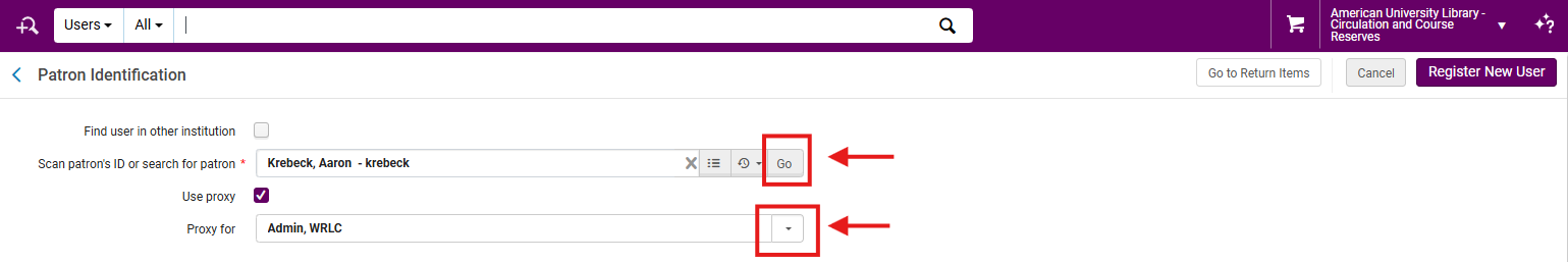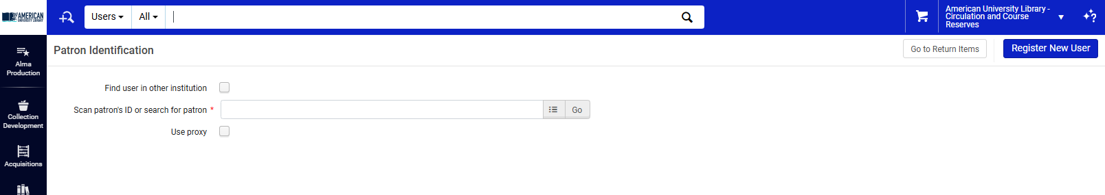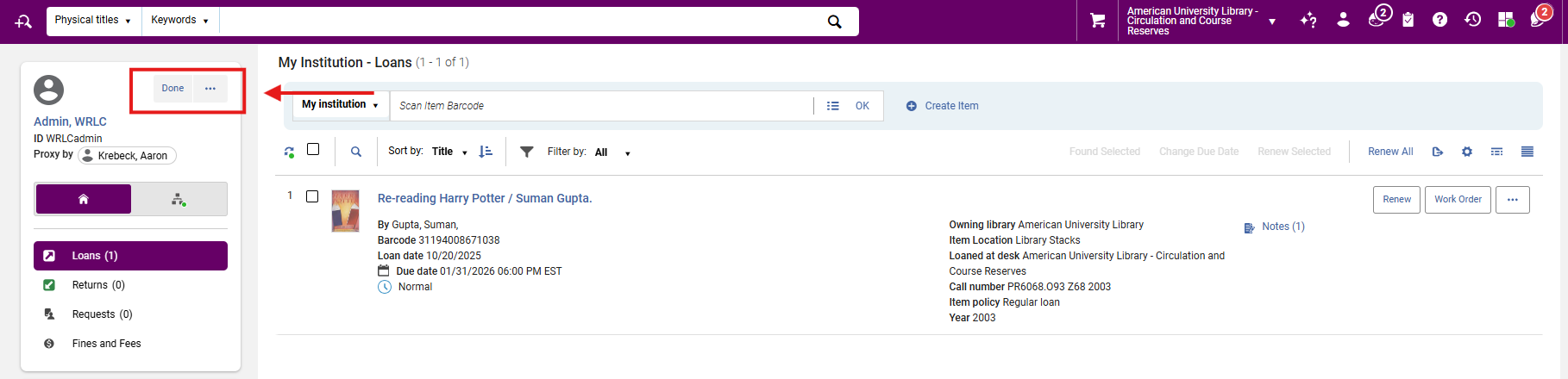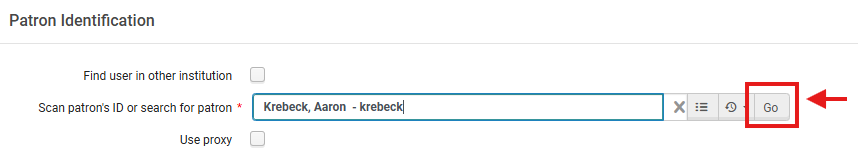Note: Proxy selection must occur before scanning items. If you forget to select a patron before scanning, Alma will create loans under the proxy’s own record, not the intended account.