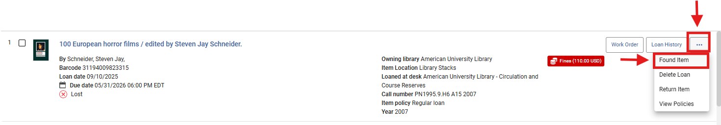 - Select <Return> to Discharge the item if returned, or select <Found> to restore the loan manually; Adjust fees as needed.