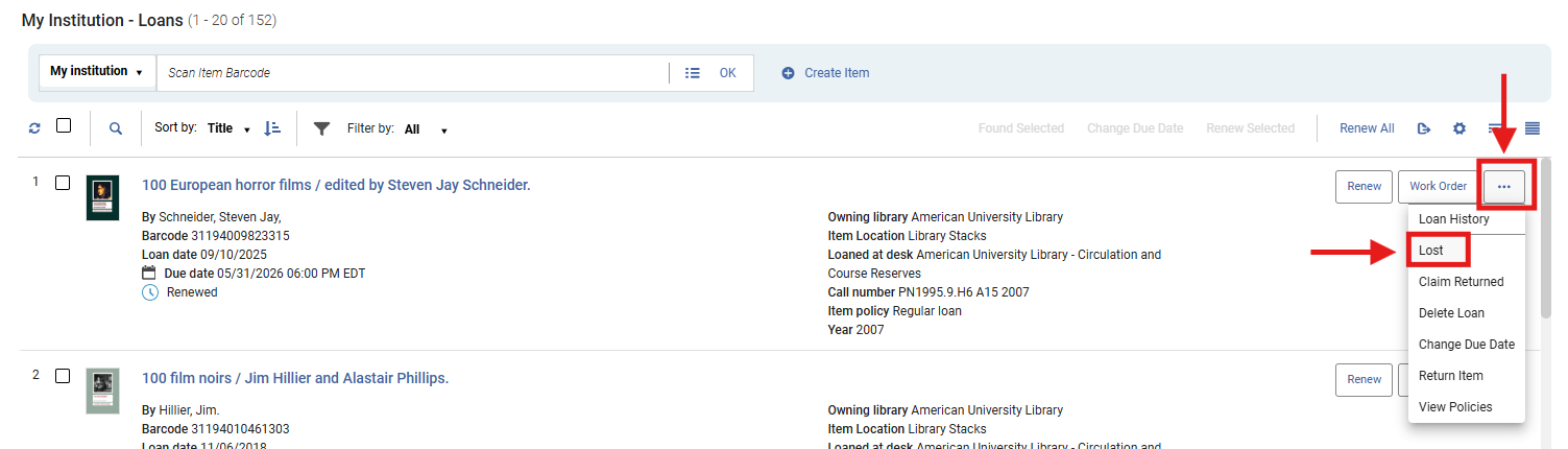 3: Display All Loans In the Loan Display dropdown, select <All>; Locate the item that should be marked Lost