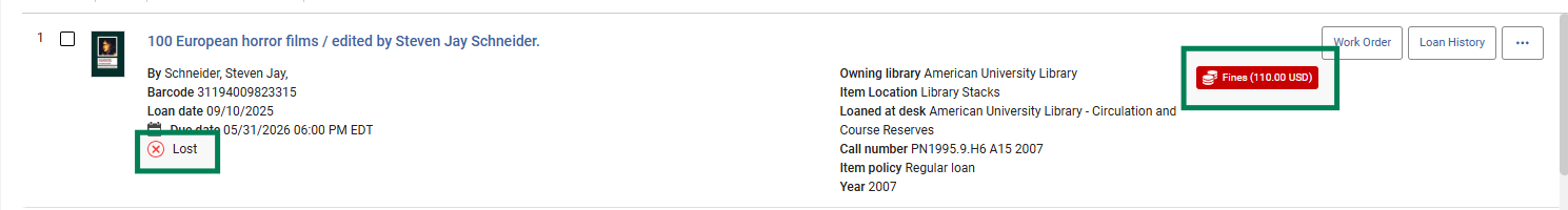 - The Loan record will then update to reflect the associated fines and Lost status: