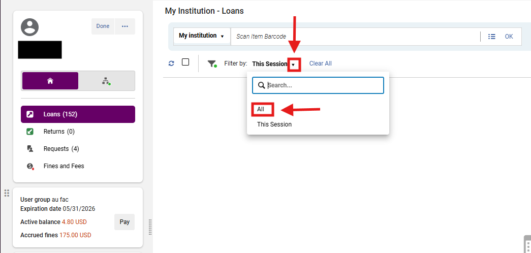 Note: Some items may not appear under “This Session.” Always switch to All Loans to avoid marking the wrong item.