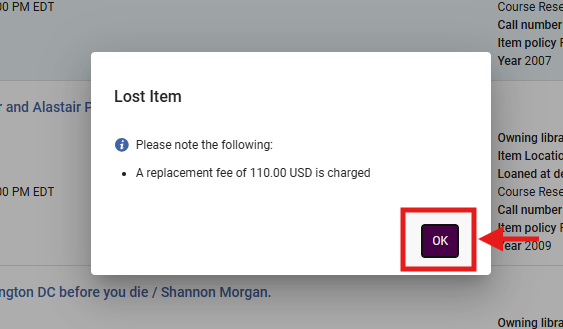 5: Confirm the Lost Status The Lost Item dialog box will open and indicate the item's new Lost status and the Lost Item Replacement fee (if configured); Review the fee information and Select <OK>