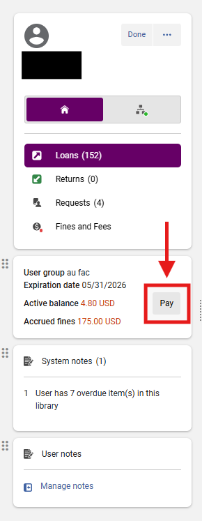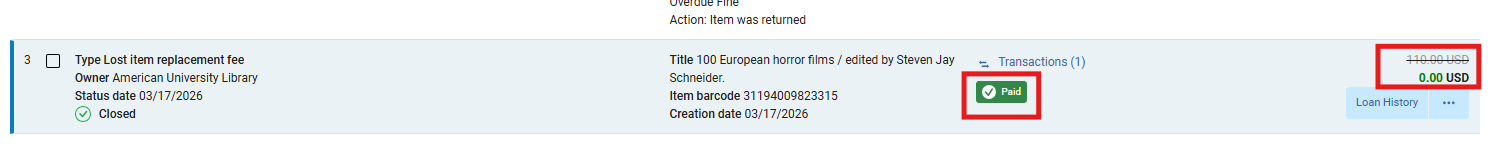 - The Loan record will update to Paid and the fine amount will reflect a zero balance