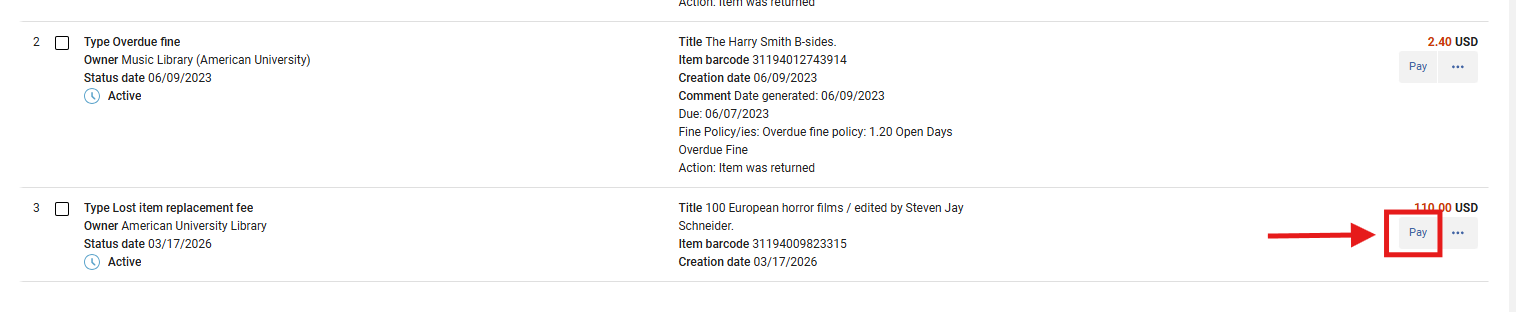 6. My Institution - Fines and Fees Locate the Lost item from the resulting list Fines and Fee full list; Select Pay for the specific item you wish to resolve