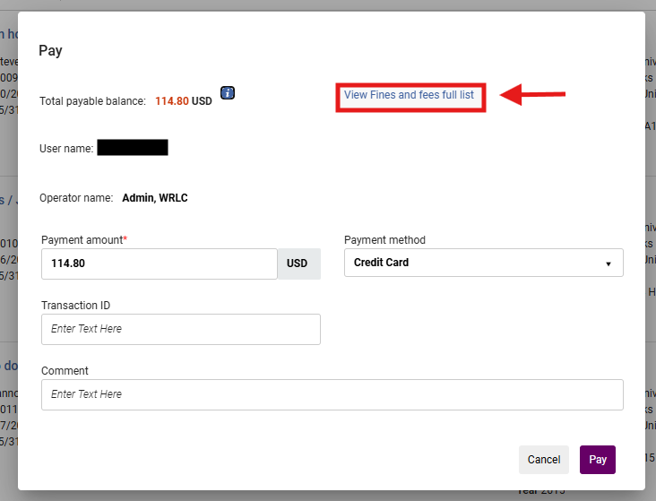 5: Select <View Fines and fees full list> Selecting specific fines ensures that only the intended lost item charge is processed and that other fines are not accidentally paid or altered