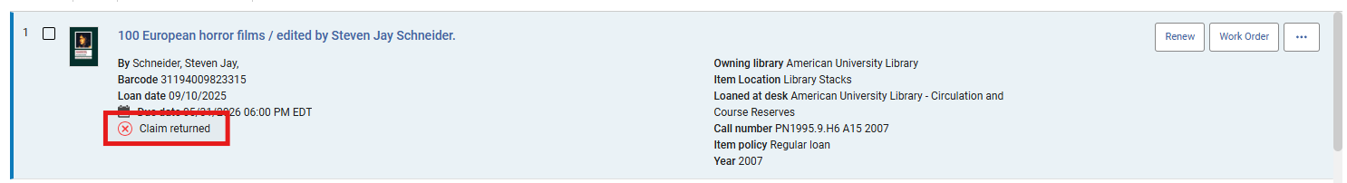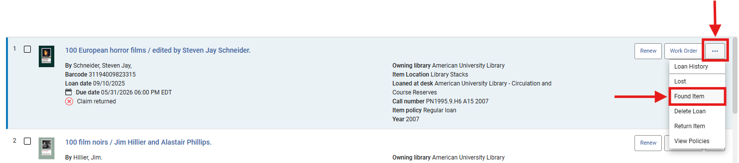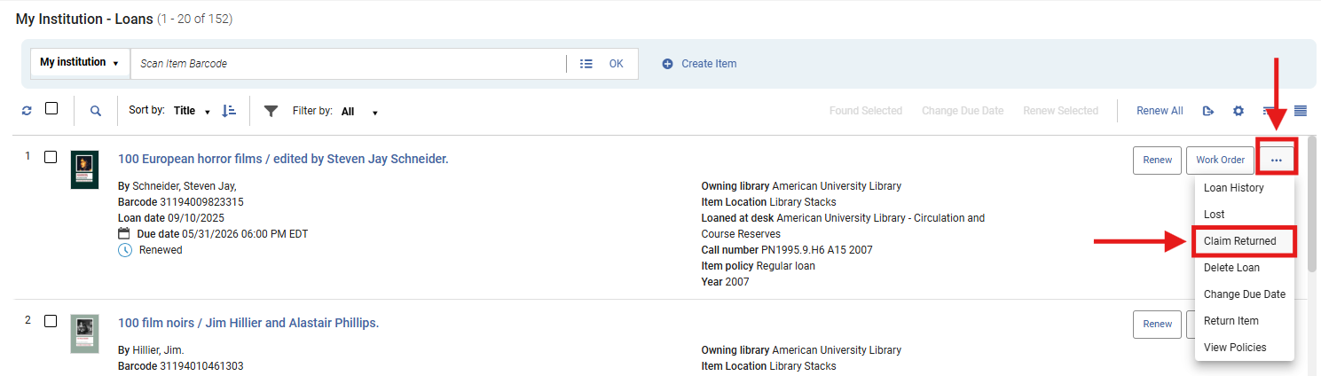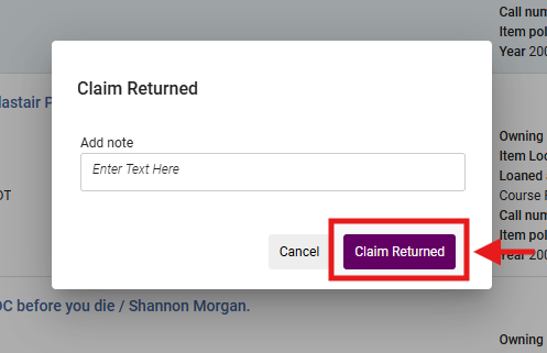 4: Apply Claimed Returned Status Open the row action menu (⋯) for the item; Select <Claimed Return>