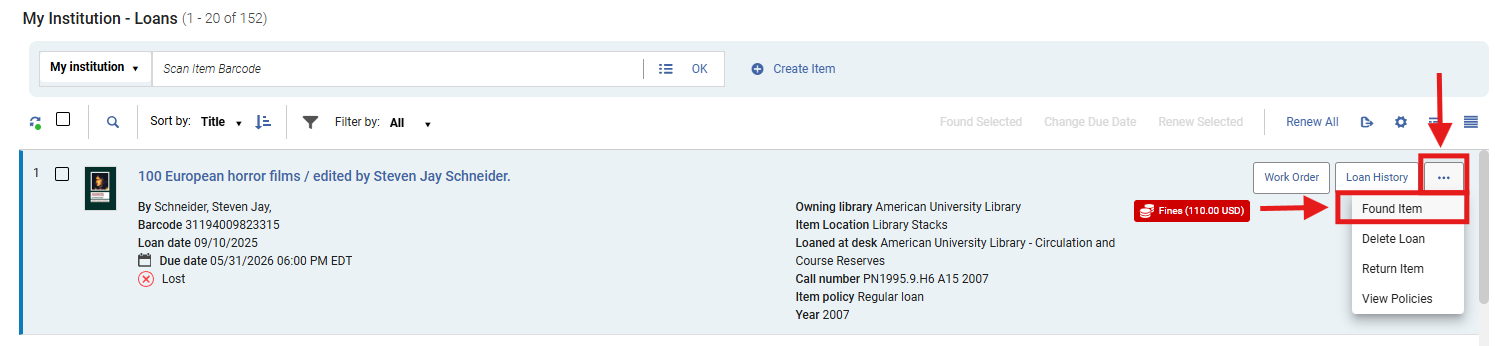 4: Remove the Lost Status In the loan row, open the row action menu (⋯); Select <Found Item>