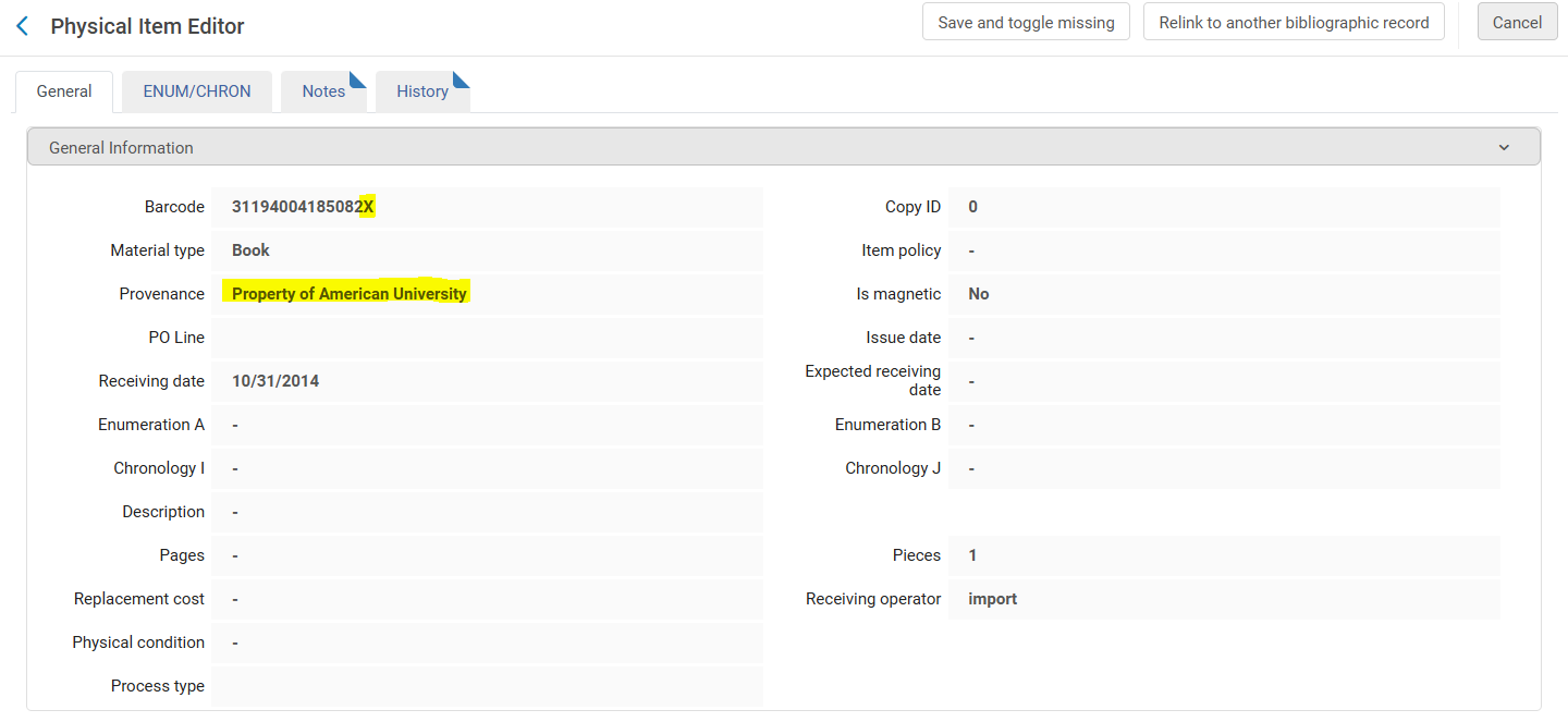 The barcode will have an 'X' appended to the end. In addition, a provenance code is added to keep track of which Institution owns the item.