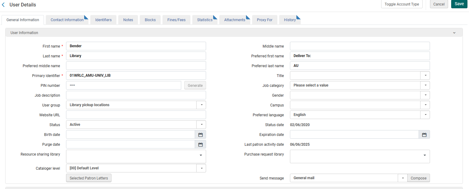 - The Library Pickup Locations user group is configured for all requests to be personal home delivery.